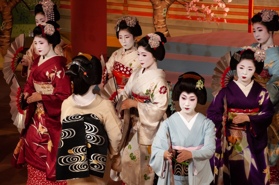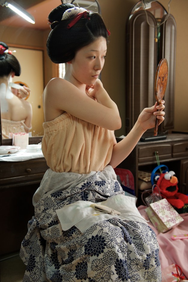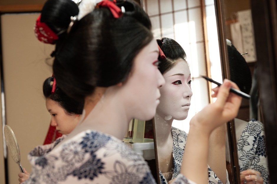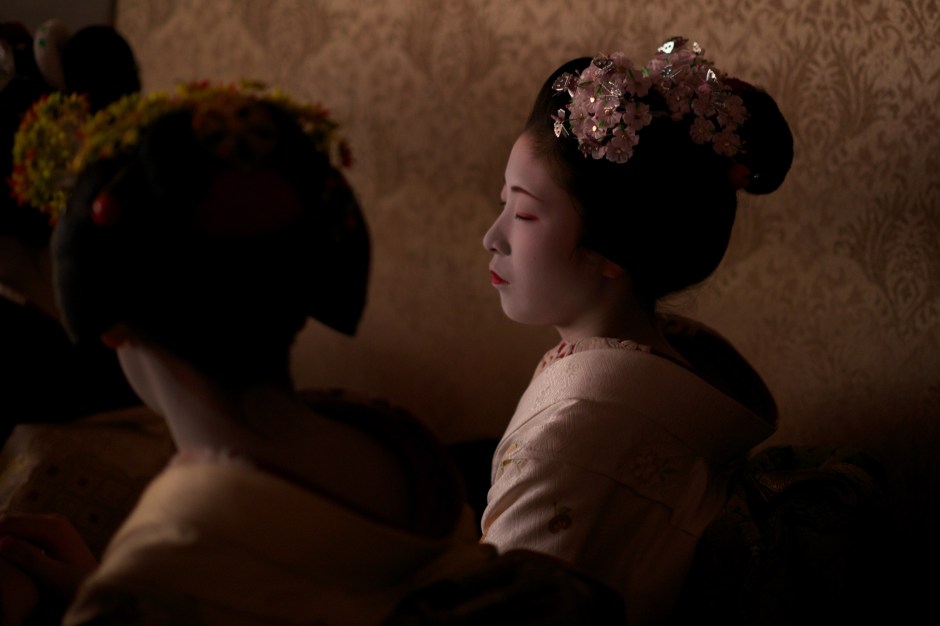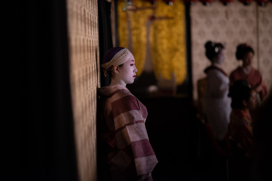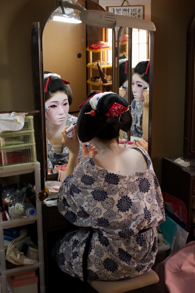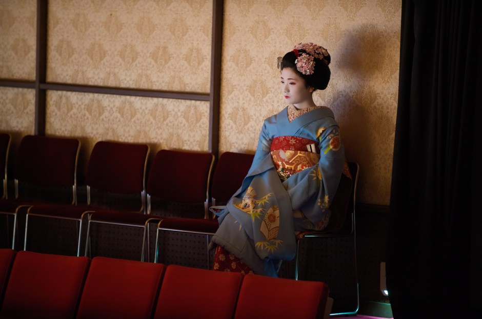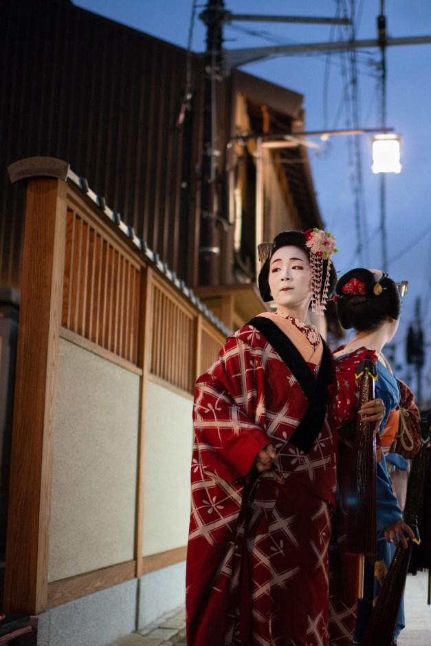 Nothing is easy. There are the animistic origins of the seasons which they reflect in their outfits and their propitiatory dances, the Kabuki theatre with its hieraticisms and surprising dynamics, the Noh theatre and its metaphysical recitations, the adornments on their headdresses for the ephemeral beauty of flowers and a sense of courteous art they distill in their interpersonal skills. They answer most request from the Municipality of Kyoto for public events, the tourism industry for shows and the many temples for the accomplishments of the rituals. From morning until evening, they dance, play the flute and drum, rehearse at theatre, go to singing classes, practice the tea ceremony. Then, when sun sets, the guests of the tea houses await, prepared to submit to the powerful mechanics of the Maiko ( 舞妓, a Geisha apprentices) and the Geiko (芸子, word used in Kyoto). In these evenings, the guests discuss, admire, laugh at the passing of time – and a lot at themselves. Far from clichés, these living creations represent an ideal of independence through the practice of Arts, inspiring both men and women who frequent the Okiya (tea house) of the five Geisha districts in Kyoto.