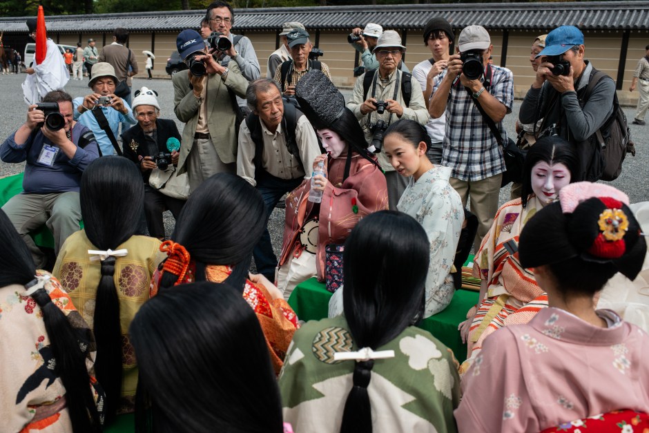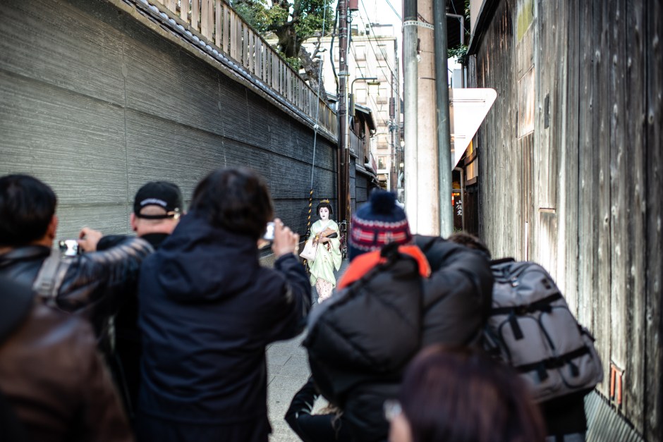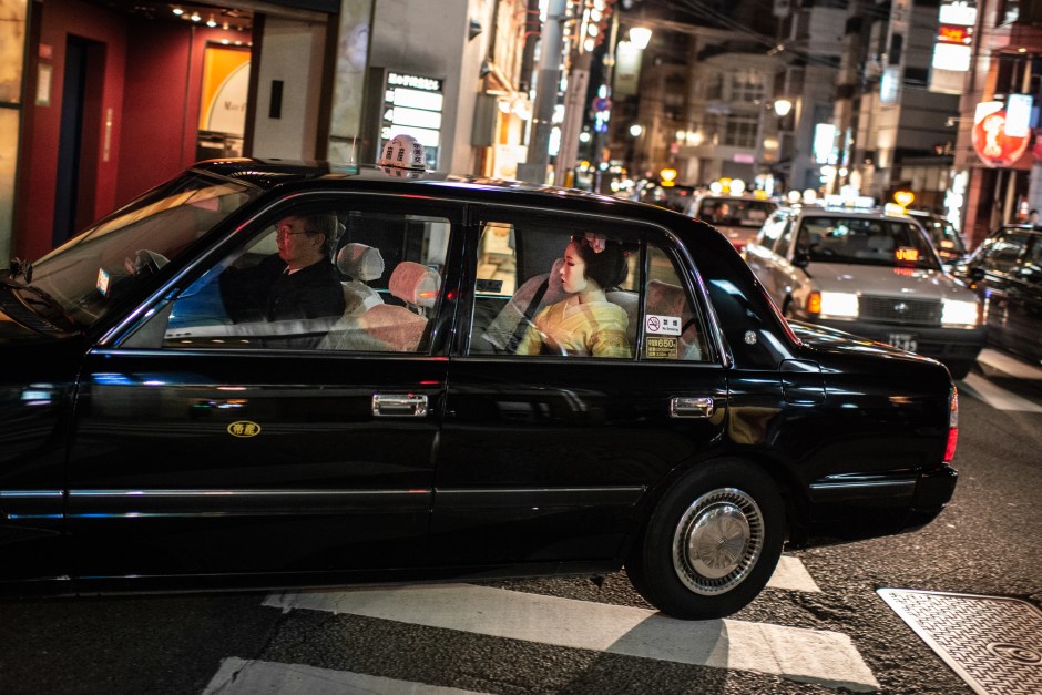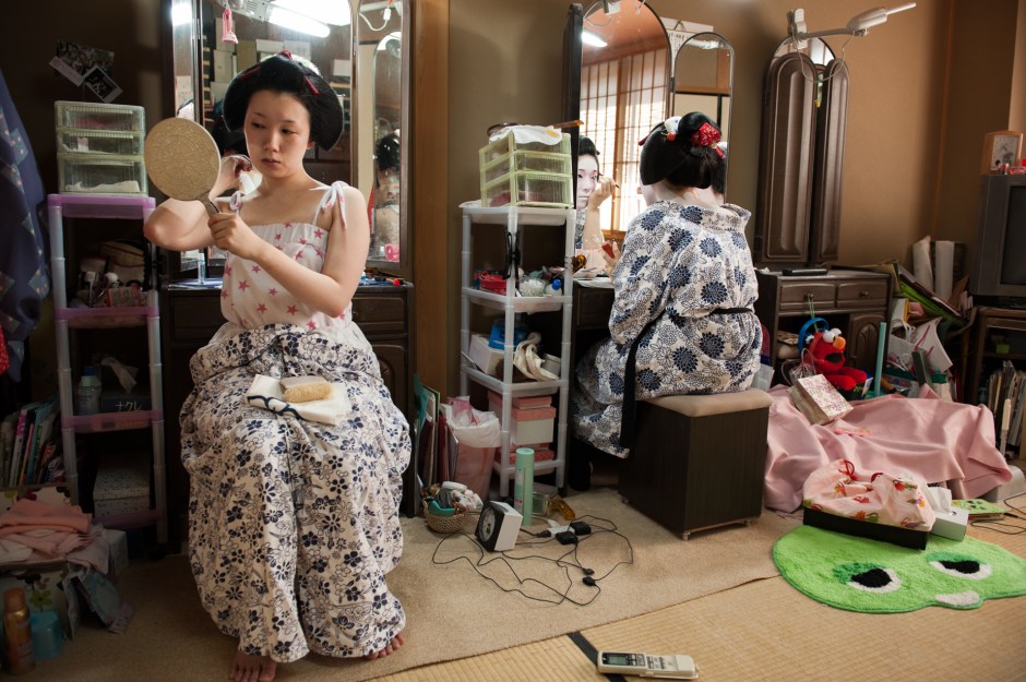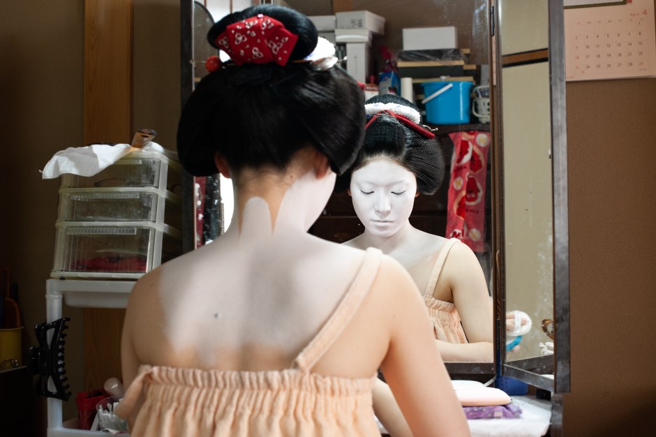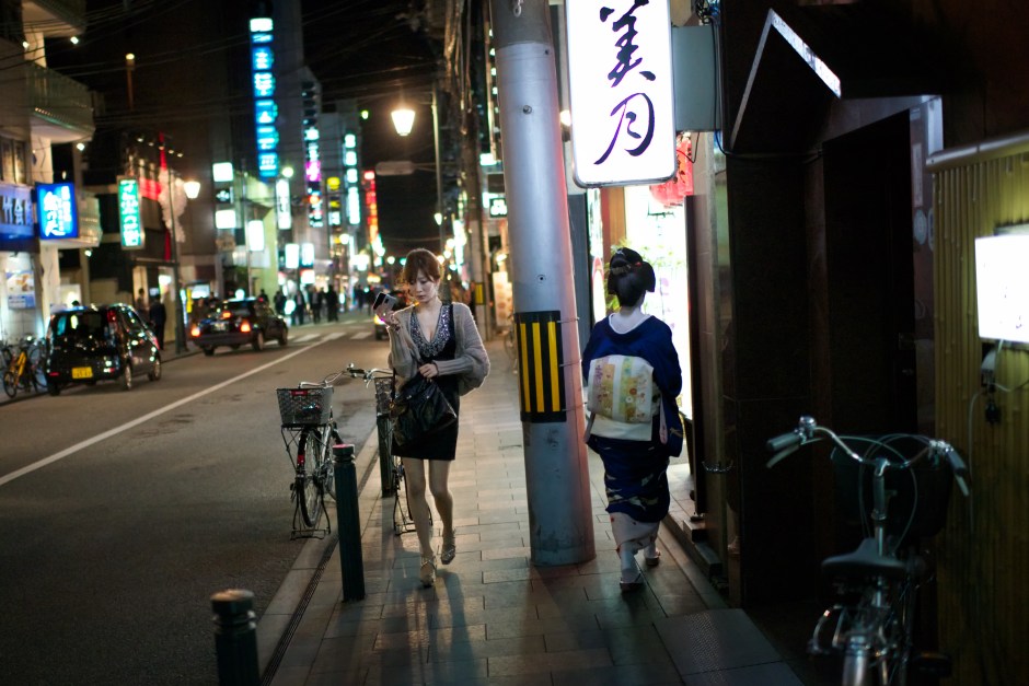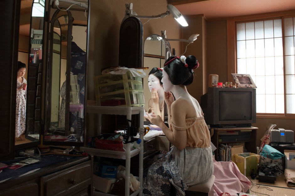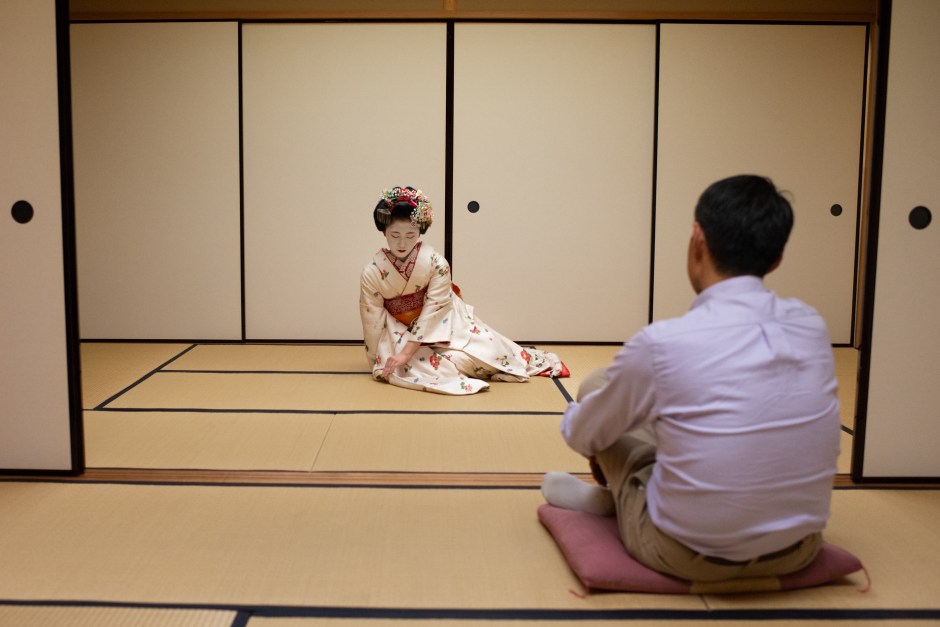 Nothing is easy. There are the animistic origins of the seasons which they reflect in their outfits and their propitiatory dances, the Kabuki theatre with its hieraticisms and surprising dynamics, the Noh theatre and its metaphysical recitations, the adornments on their headdresses for the ephemeral beauty of flowers and a sense of courteous art they distill in their interpersonal skills. They answer most request from the Municipality of Kyoto for public events, the tourism industry for shows and the many temples for the accomplishments of the rituals. From morning until evening, they dance, play the flute and drum, rehearse at theatre, go to singing classes, practice the tea ceremony. Then, when sun sets, the guests of the tea houses await, prepared to submit to the powerful mechanics of the Maiko ( 舞妓, a Geisha apprentices) and the Geiko (芸子, word used in Kyoto). In these evenings, the guests discuss, admire, laugh at the passing of time – and a lot at themselves. Far from clichés, these living creations represent an ideal of independence through the practice of Arts, inspiring both men and women who frequent the Okiya (tea house) of the five Geisha districts in Kyoto.